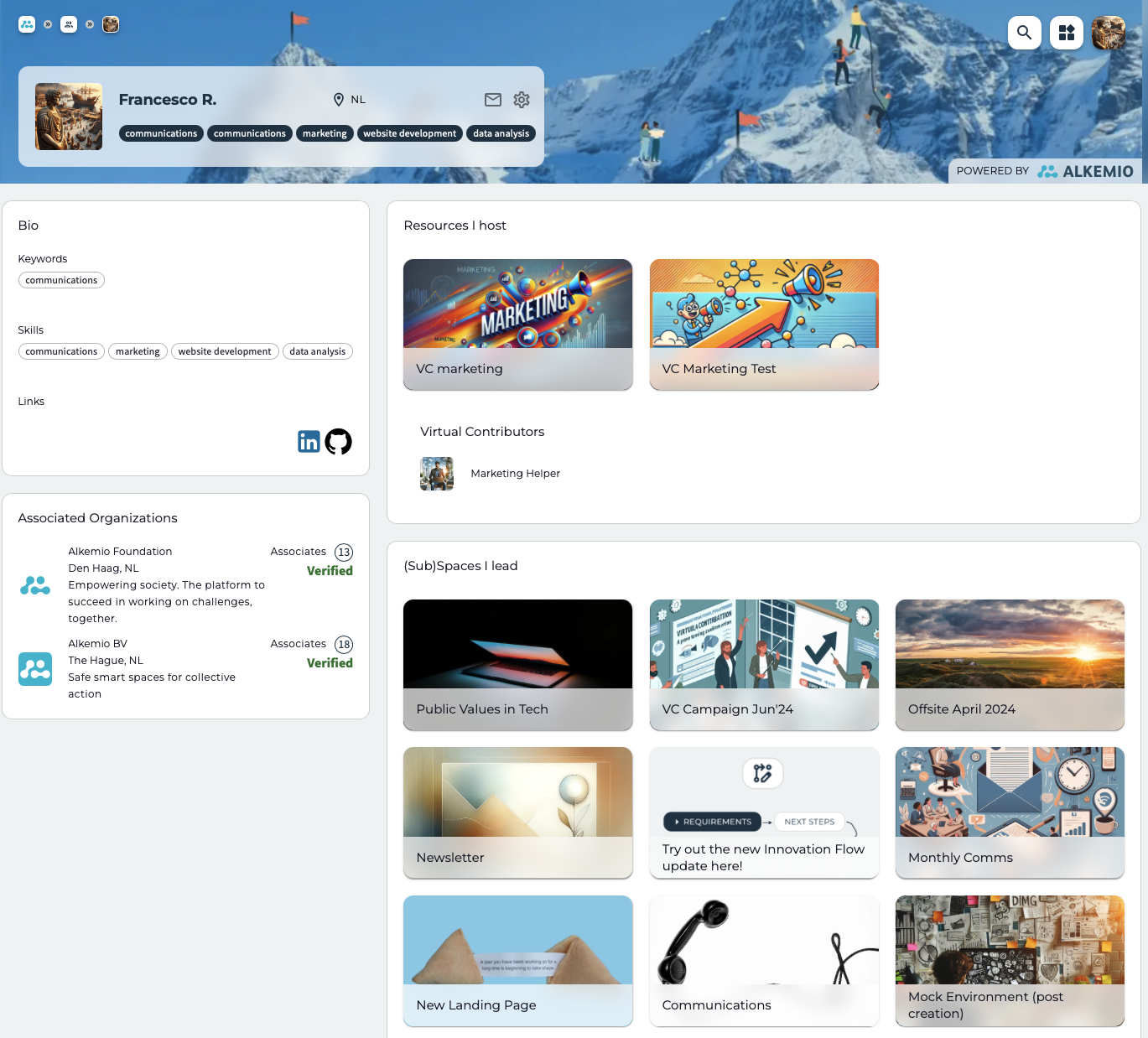 Het Profiel in Alkemio is een centrale plek die een overzicht biedt van de vaardigheden, projecten en bijdragen van een gebruiker. Het is ontworpen om samenwerking te bevorderen door snelle toegang te geven tot belangrijke informatie over de gebruiker. Hieronder volgt een gedetailleerd overzicht van wat een profiel bevat.